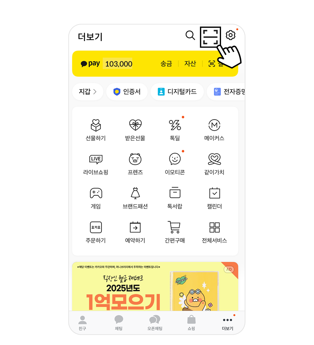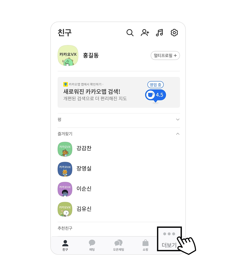 1휴대폰에서 카카오톡 앱 실행 후 ‘더보기’ 메뉴 클릭