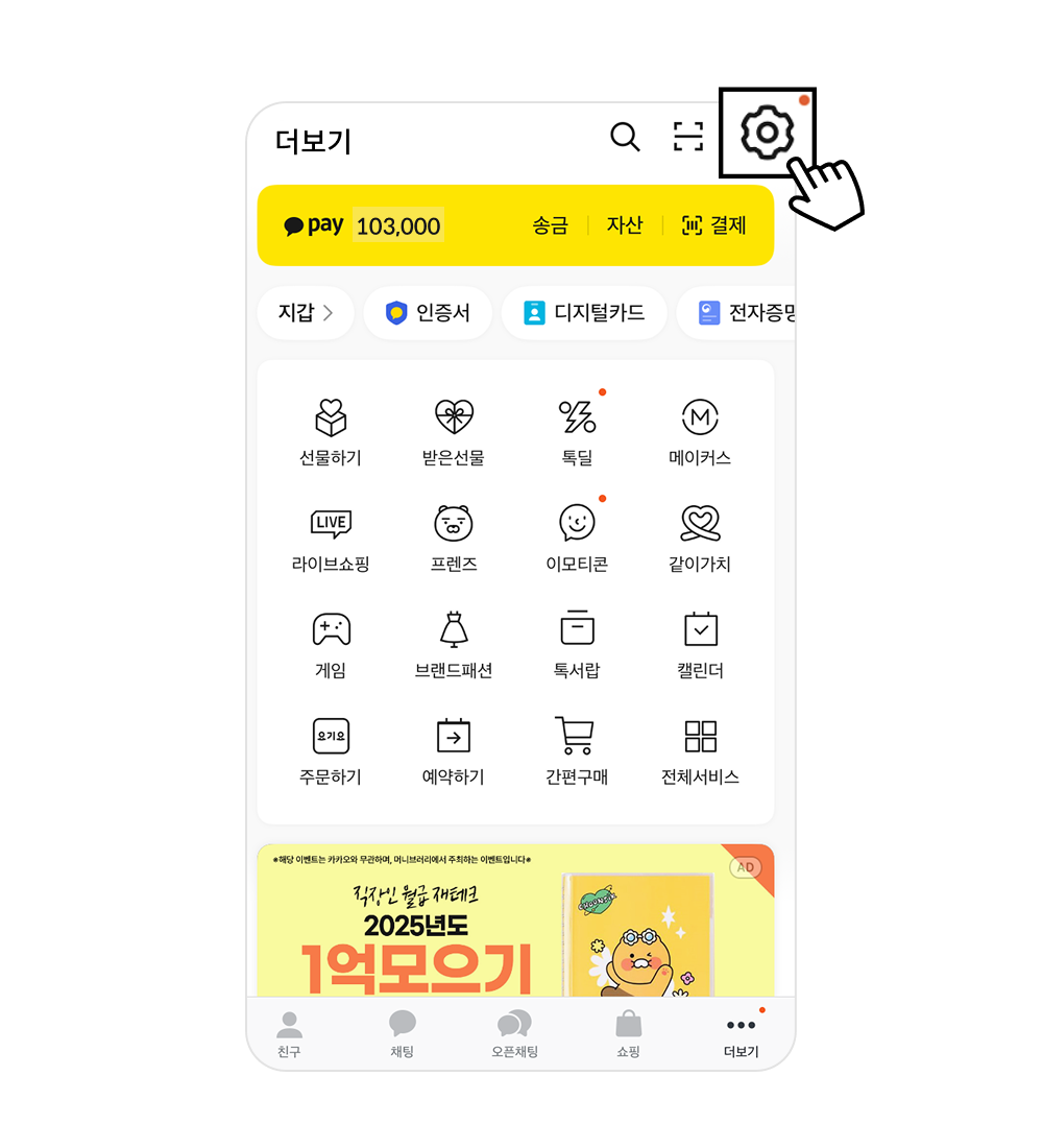 ⑴ 휴대폰에서 카카오톡 앱 실행 후 ‘더보기’ 메뉴 클릭