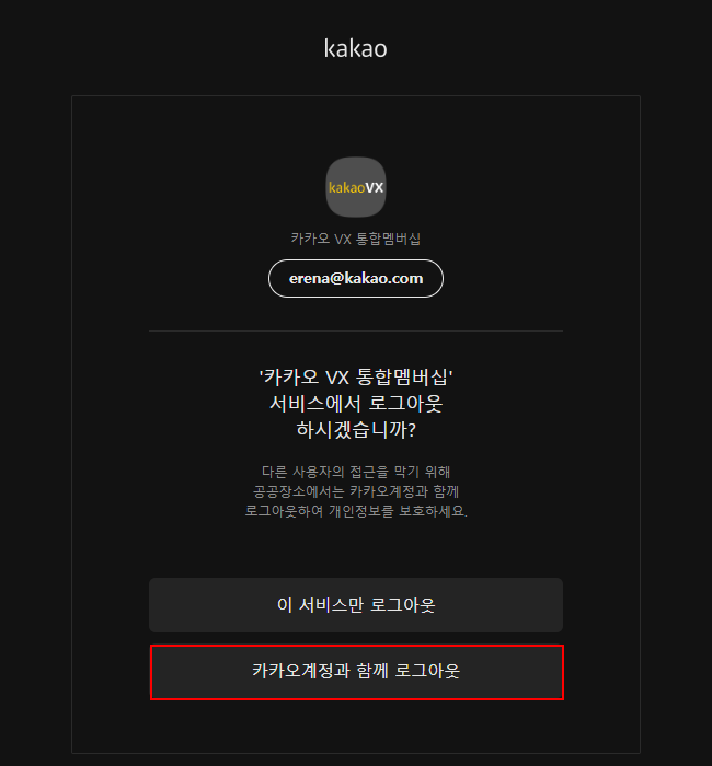 1명시적 로그아웃이미 로그인되어 있는 경우, [카카오계정과 함께 로그아웃] 클릭하여 로그아웃 진행하세요. 아직 로그인하지 않았으면, 2단계로 넘어가세요.