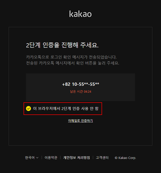 아이디/비밀번호 로그인하는 경우, [간편로그인 정보 저장] 선택하고 로그인하시고, 2단계 인증창에서 [이 브라우저에서 2단계 인증 사용 안 함] 선택하고 로그인 하세요.